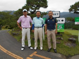 | 平成28年7月23日(土)、早朝6:40にK氏に迎えに来てもらいコースへ!達さんも到着!! まるで北海道のような肌寒い曇り空に7:40アウトコーススタート!! 曇り、Aグリーン、青ティー。 |