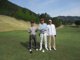 | 1番P5、FWセンター奥に林があるのでJrは3番アイアンでナイスフェードのビックドライブでFW右ベストポジションへ!濱ちゃんはDをナイスショットでFWセンターへ!セカンドを右斜面へ打つも3打目を見事ピン左5mにナイスオンして2Pのパー!池さんはDがフックして左FWへ行き連続トップしてダボ(^^;)。私はDがフック気味で左ギリギリFWへ、そこから林が邪魔で狙えず、スライスを掛けようと9Wで打つも林方向へ!何とか抜けて左の上の段のFWへ、そこから145Yを8番Iでややトップ気味ながら右手前ピンの右手前4mにナイスオン!Jrセカンドを左斜面ラフへ打つもそこから軽いスイングでピン手前1.2mにナイスオン!!私は上りのパットを打ち切れずパー!Jrはスライスラインを右へ外しパー! 2番P3、Jrは8番Iの素晴らしいボールでピン手前7mにオンして惜しくもカップ右淵で止まりパー!濱ちゃんは左手前にショートしパットで寄せてナイスパー! |